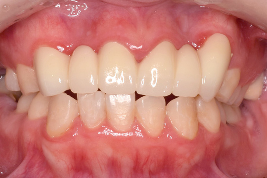 ジルコニアを装着した歯は周りとなじみ、自然な仕上がりになりました。噛み合わせも問題なく、上あごもインプラント併用のリプロハイグリップ義歯で食べ物がしっかり噛めるようになっています。患者さんには「見た目もきれいになってうれしい。しっかり噛めるようになって、主人や友達と食事に行くのが楽しみ」と大変ご満足いただきました。現在は、良好な状態を保つため定期的に予防メンテナンスにてご通院いただいています。