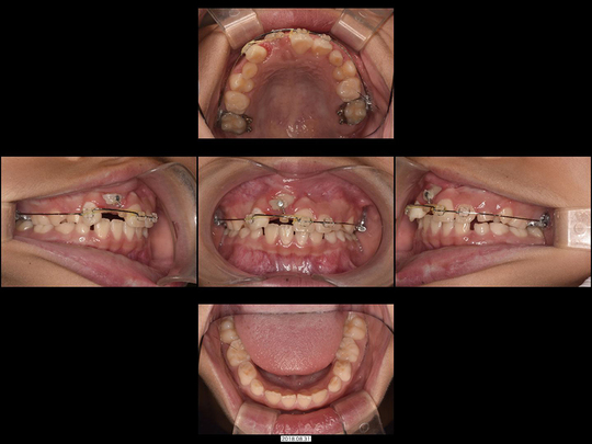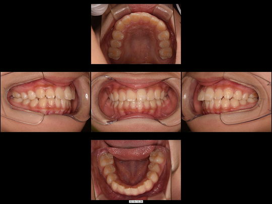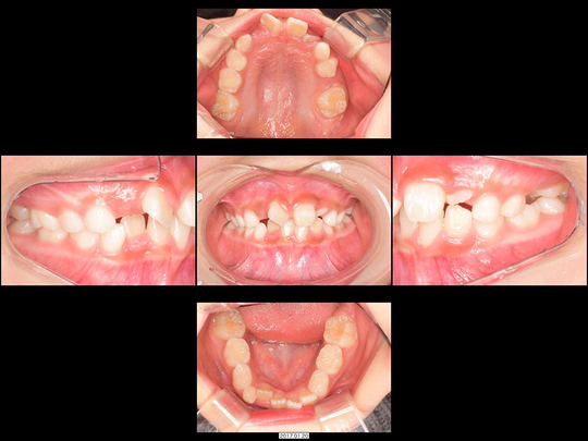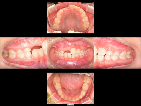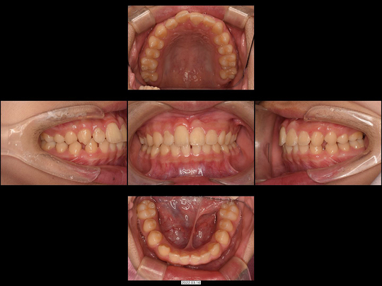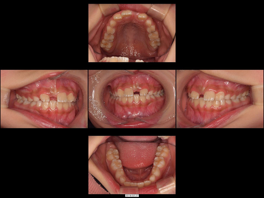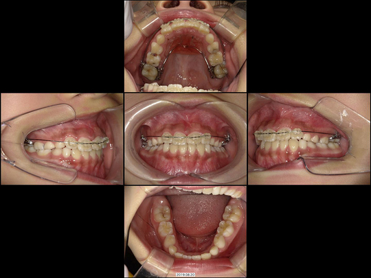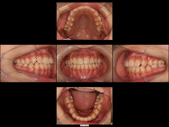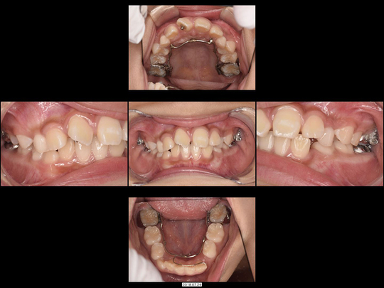 | 治療の説明 | 前歯がねじれているのを改善したいというご希望でした。「抜歯するしかない」と診断されるような状態です。 固定式の拡大装置を用いて前歯と奥歯の永久歯が生え変わるスペースを作り、正しい歯並びと咬み合わせに誘導(咬合誘導)しました。非抜歯・ワイヤー矯正なしで終了できています。 |